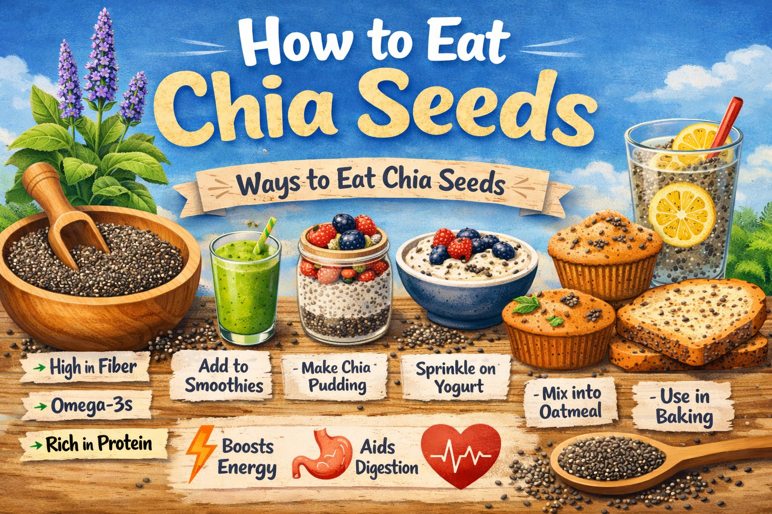 This is the lowest-effort method because you just stir and eat. For oatmeal, add one to two teaspoons of chia after cooking, then wait a few minutes. It softens fast and makes oats feel richer. For yogurt, mix in chia and let it sit for ten minutes, or prep it the night before for a thicker bite. You can also add chia to cereal after you pour milk, then eat a little slower. These quick add-ins are perfect when you want results without learning recipes. If you’re wondering how to eat chia seeds every day without getting bored, this habit is easy to repeat.